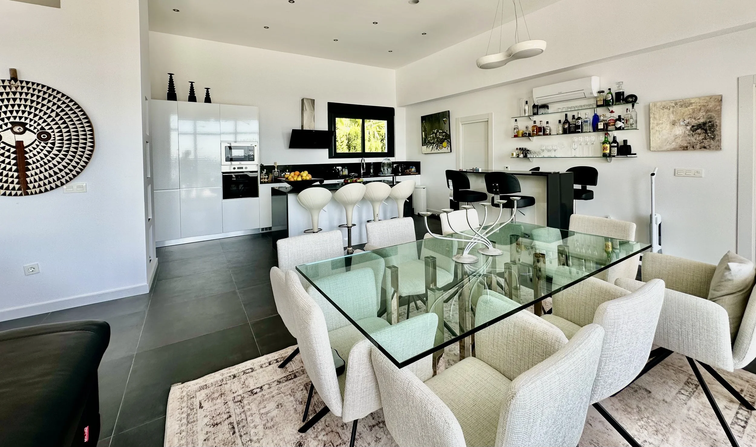 La villa se compose d'un hall d'entrée avec une toilette d'invités, un immense espace ouvert avec salon, salle à manger, cuisine américaine totalement équipée, espace bar, le tout communiquant avec les terrasses.